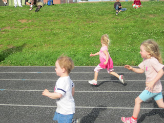 Parker is trying to stand on everything. She moves her body to the chairs or table stands up. She's very careful at doing this and then looks so proud when she accomplishes her task. While Parker has been working on crawling and standing, Bailey has started her track meet series. She's figuring the races out and running fast now! She insists on wearing her dresses to these meets!